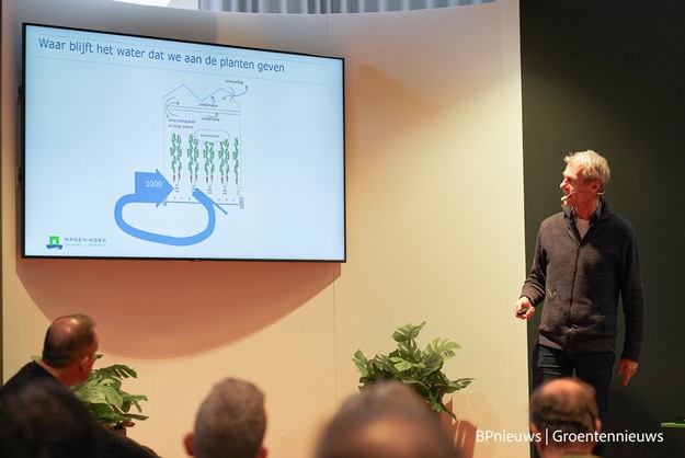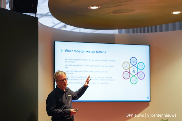 Namens Cultilene neemt Remy Maat het stokje over. Hij toont hoe verdamping, straling, wateropname en wortelactiviteit continu met elkaar in verband staan. Door de opmars van ledlicht daalt de stralingswarmte, waardoor het gewas minder verdampt en dus minder water opneemt. Dat vraagt om precieze sturing.