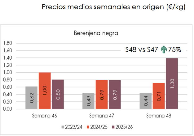 Courgette, komkommer en aubergine werden extra hard geraakt door het slechte weer. De aanvoer naar de veilingen in Almería daalde met 10 tot 20% bij courgette en komkommer, en zelfs met 35 tot 40% bij aubergine. Die schaarste had een duidelijk effect op de prijzen. Courgette steeg met 30%, komkommer met 42% en zwarte aubergine spande de kroon met een prijsstijging van 75% ten opzichte van week 47.
