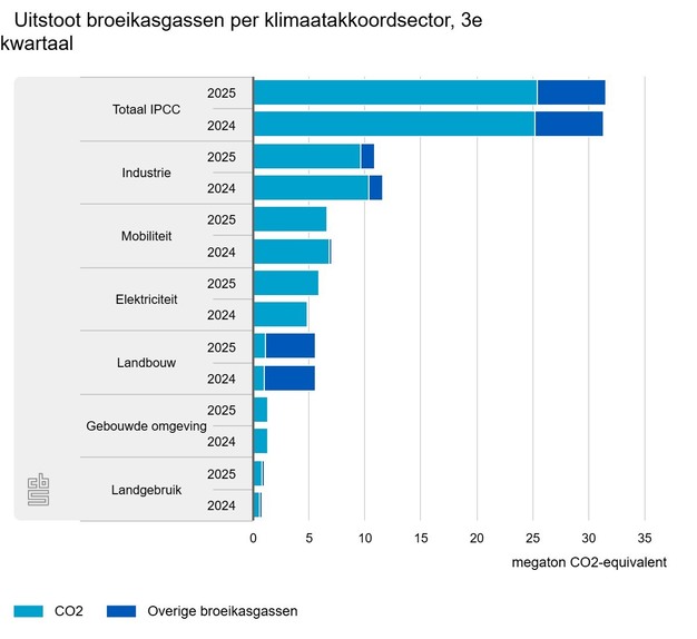 In het derde kwartaal van 2025 heeft de elektriciteitssector 20 procent meer broeikasgassen uitgestoten dan in hetzelfde kwartaal van 2024. Dat meldt het CBS. De export van elektriciteit was hoger dan een jaar eerder, terwijl er minder elektriciteit werd geïmporteerd. Daardoor werd er 10 procent meer elektriciteit geproduceerd in Nederland. Voor de productie werden ook meer fossiele brandstoffen verbruikt; vooral het verbruik van steenkool door kolencentrales was aanzienlijk hoger. De bijdrage van de elektriciteitssector aan de totale uitstoot was bijna 19 procent in het derde kwartaal van 2025, tegen 15,5 procent in hetzelfde kwartaal van 2024.