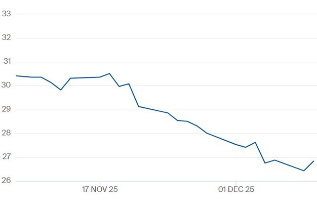 TTF-gasprijs voor het contract Cal 2026 t/m 9 december 2025. Klik hier voor de actuele gascontractprijzen.