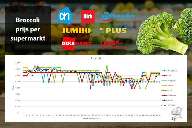 © Supermarktscanner.nl Weinig verschuivingen bij broccoli in week 50. Alleen PLUS voert een prijsverhoging door van 6 cent, waardoor deze uitkomt op 1,25 euro per 500 gram.