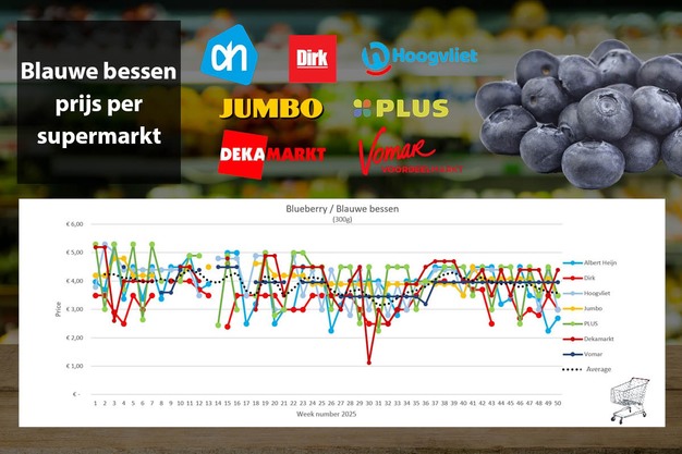 © Supermarktscanner.nl Weer heel veel acties in blauwe bessen. Albert Heijn heeft de laagste prijs, 2,69 euro voor een bakje van 300 gram. Dirk en Hoogvliet volgen en komen uit op 2,99 euro, Jumbo en Plus verlagen ook de prijzen, maar met 3,49 euro is er een groot prijsverschil. DekaMarkt heeft geen aanbieding en komt uit op 4,39 euro. De gemiddelde weekprijs zakt met 30 cent naar 3,43 euro.