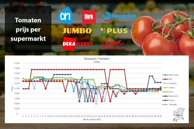 © Supermarktscanner.nl Een prijsstijging van 10 cent voor 500 gram losse trostomaten bij Albert Heijn (1,05 euro) en PLUS (99 eurocent), beide met 10 cent. Hoogvliet heeft online geen losse trostomaten beschikbaar. Gemiddeld stijgt de weekprijs met 6 cent naar 1,04 euro.