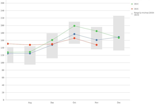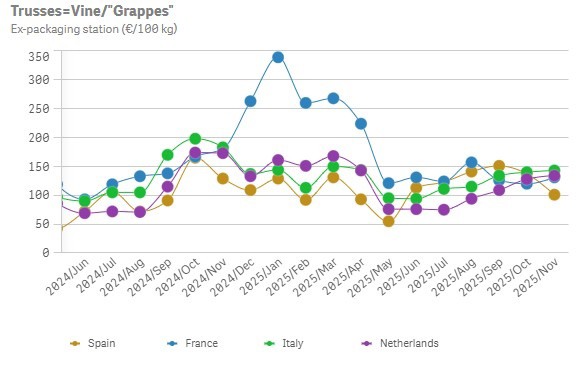 Bijna in alle gevallen lagen de tomatenprijzen in november lager dan een jaar eerder. De uitzondering, zoals wel vaker, is Frankrijk, waar cherry- en specialtytomaten in november wel beter betaald werden dan in 2024. Over de hele linie lag de tomatenprijs in november in de Europese Unie onder het vijfjarig gemiddelde met een kiloprijs van 1,48 euro. Hier is Nederland de uitzondering, zo blijkt uit cijfers op het EU-tomatendashboard dat de Europese Commissie bijhoudt.