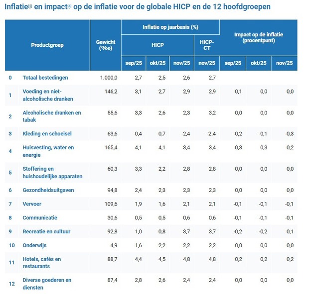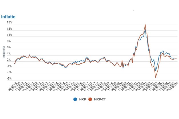 De Belgische inflatie is in november 2025 licht gestegen. Volgens de geharmoniseerde consumptieprijsindex (HICP) van Statbel kwam de inflatie uit op 2,6%, tegenover 2,5% in oktober. Ten opzichte van september (2,7%) is dit een lichte daling.