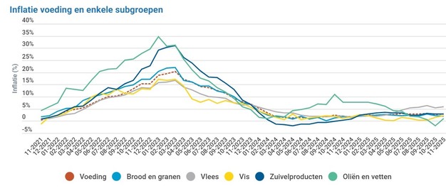 In de voedingssector nam de inflatie toe naar 2,9%, tegenover 2,7% in oktober. Vooral vleesprijzen stegen fors, met een jaar-op-jaar inflatie van 5,8%. Ook zuivelproducten (+2,9%) en vis (+2,1%) waren duurder, terwijl brood en granen iets minder stegen (2,0%). Olieprijzen noteerden een stijging van 1,1% na een daling in oktober.