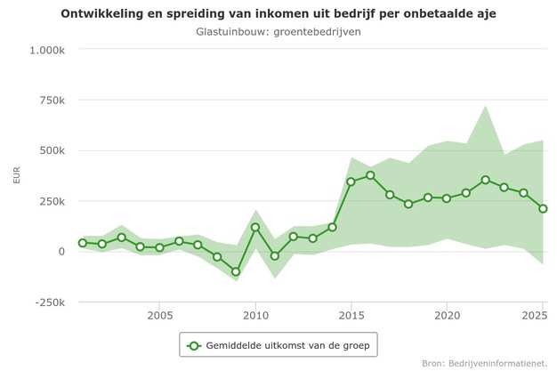 Het gemiddelde inkomen uit bedrijf per onbetaalde aje van glasgroentebedrijven wordt in 2025 geraamd op ongeveer € 210.000, circa € 75.000 euro lager dan in 2024 doordat de kosten sterker stegen dan de opbrengsten. De opbrengsten uit gewassen stegen met gemiddeld 8%. Door het zonnige weer zijn de volumes (kgopbrengsten) bij alle gewassen gestegen. Daarnaast nam de opbrengst uit energieverkoop ook toe voor teruggeleverde elektriciteit. De kosten voor energie zijn echter harder gestegen, onder meer door hogere energieprijzen. Daarnaast namen ook de kosten van uitgangsmateriaal, arbeid en materiële activa (onder andere afschrijvingen en onderhoud) toe.