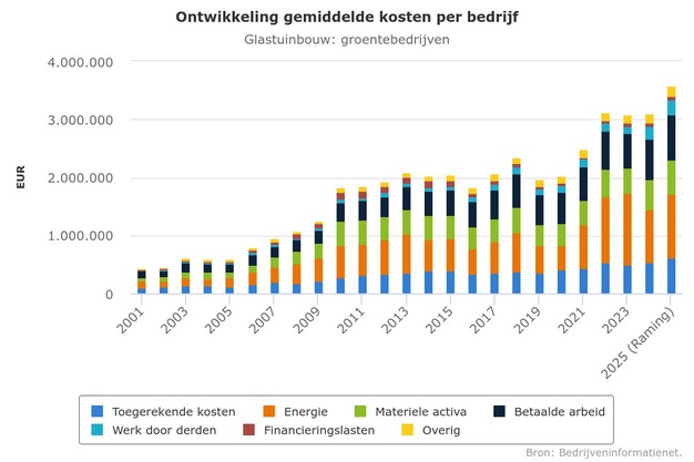 Door een voorjaar met veel zonuren zijn de producties voor alle gewassen gestegen. De verwachting is dat de economische opbrengsten per gemiddeld glasgroentebedrijf met bijna 10% zijn gestegen ten opzichte van 2024, maar dat de betaalde kosten en afschrijvingen met 15,5% zijn gestegen.
