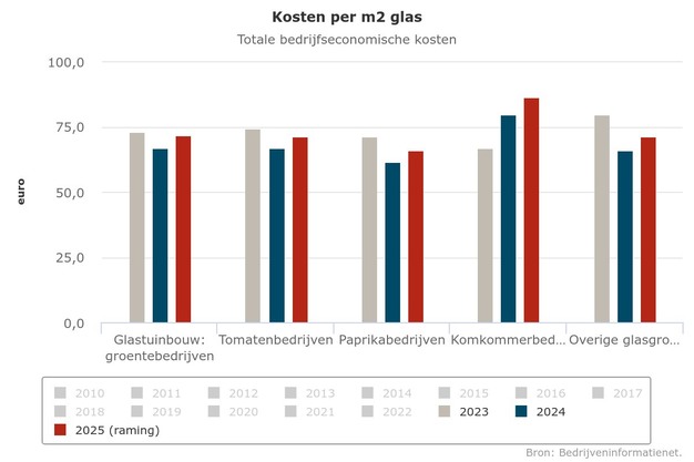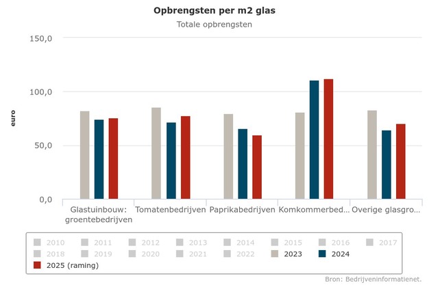 In 2025 wordt het nettobedrijfsresultaat voor een gemiddeld Nederlands glasgroentebedrijf geraamd op ongeveer 4,20 euro per m², wat een daling van ongeveer 3,20 euro (of -44%) per m² betekent.