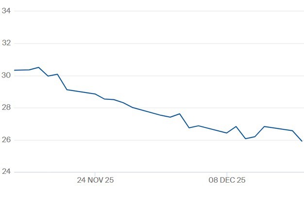 TTF-gasprijs voor het contract Cal 2026 t/m 16 december 2025. Klik hier voor de actuele gascontractprijzen.