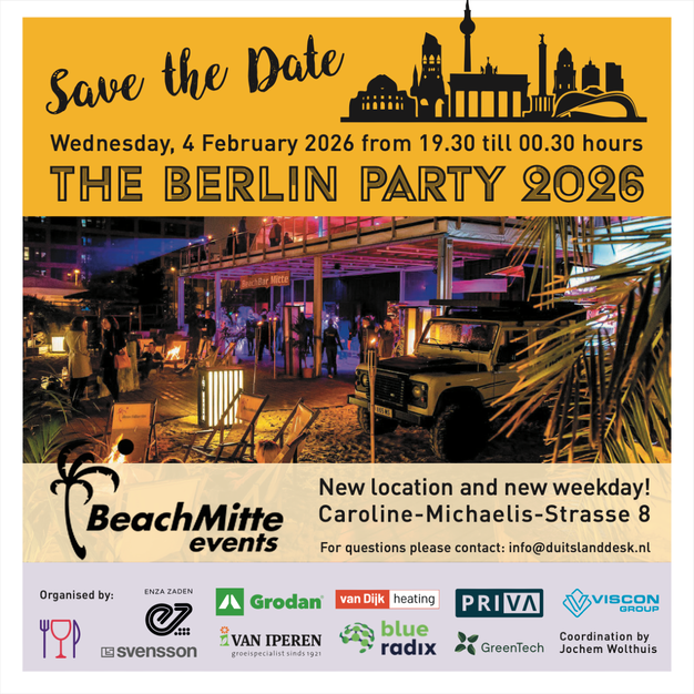 "De Berlin Party is een traditie geworden waar telers, retailers en technologische partners elkaar treffen in een warme, ontspannen setting," zegt coördinator Jochem Wolthuis (Duitsland Desk Agri Food & Flowers). "Onze nieuwe locatie en de timing op de eerste dag maken het gemakkelijker dan ooit voor wereldwijde telers om zich bij ons aan te sluiten – en te genieten van een onvergetelijke avond."