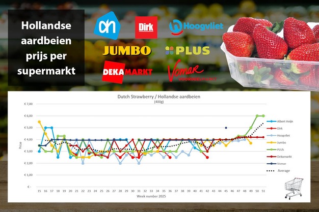 © Supermarktscanner.nl Bij Jumbo wederom geen aardbeien in het online assortiment en bij Dirk en Hoogvliet ontbreken aardbeien al een aantal weken. Drie van de zes gevolgde supermarkten blijven online aardbeien in het assortiment houden, prijzen zijn gelijk aan week 50.