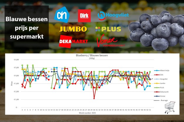 © Supermarktscanner.nl Ondanks de vele afprijzingen in week 51 blijft Albert Heijn met afstand de voordeligste in blauwe bessen. Voor de tweede week op rij is de actieprijs 2,69 euro voor een bakje van 300 gram. Jumbo komt in week 51 met een actieprijs van 2,99 euro en DekaMarkt verlaagt met 90 cent de prijs naar 3,49 euro en Vomar met 36 cent naar 3,49. De acties bij Hoogvliet en Plus zijn voorbij. Bij Dirk ontbreken blauwe bessen in het online schap. De gemiddelde weekprijs stijgt met 18 cent naar 3,61 euro.