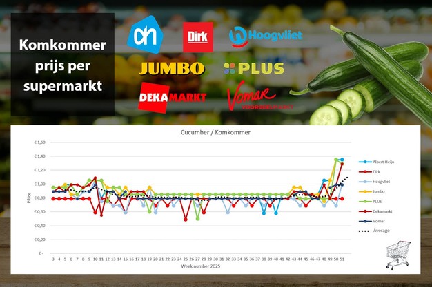 Wat nog meer opvalt is dat zowel Jumbo als Plus de komkommerprijs met 6 procent verlagen, van 1,35 euro naar 1,29 euro. Gemiddelde weekprijs stijgt verder door en ligt op 1,14 euro.