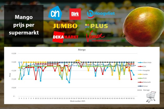 © Supermarktscanner.nl De actie bij Albert Heijn met mango verdiept. Ze verlagen de prijs met 25 cent naar 1,25 euro en daarmee zijn ze ook hier met afstand de goedkoopste aanbieder. Vorige week zette Dirk mango nog voor 1 euor in de picture, maar in week 51 ontbreken mango's in het online schap. Bij de andere vier onderzochte supermarkten zijn er geen prijsveranderingen.