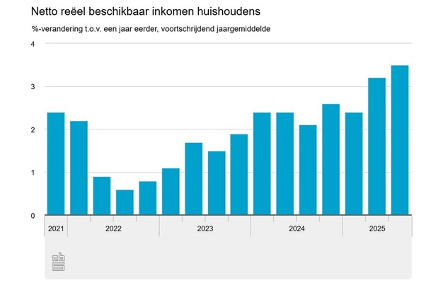 Het reëel beschikbaar inkomen van huishoudens (inkomen gecorrigeerd voor prijsveranderingen) was in het derde kwartaal van dit jaar 3,5 procent hoger dan een jaar eerder. De toename is vooral toe te schrijven aan een stijging van de beloning van werknemers, door hogere cao-lonen, en een stijging van sociale uitkeringen. De hypotheekschuld groeide met 12,7 miljard euro ten opzichte van een kwartaal eerder, naar 924,2 miljard euro. Dit meldt het Centraal Bureau voor de Statistiek (CBS) op basis van nieuwe cijfers over de financiën van huishoudens.