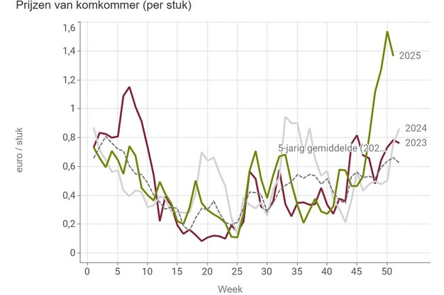 In december lagen de komkommerprijzen helemaal hoog. In week 50 werd voor kleine volumes gemiddeld 1,53 euro per stuk betaald. In week 52 zakte de middenprijs terug tot 95 eurocent per stuk. Nog altijd een prijs die hoger ligt dan 2024 en het vijfjarig gemiddelde. Begin 2026 komen meer telers in productie met een belichte teelt.
