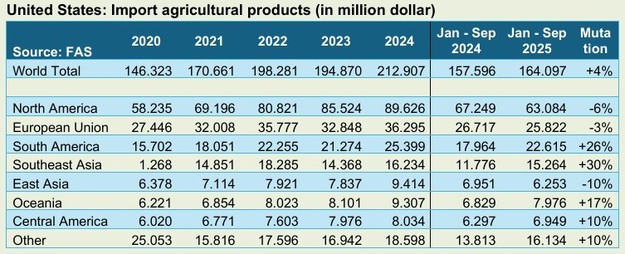 De Verenigde Staten importeren een groot deel van hun agrarische producten uit de buurlanden Mexico en Canada. In 2024 ging het hierbij om bijna 90 miljard dollar van de totale import van 213 miljard dollar. Mexico was met bijna 50 miljard dollar de belangrijkste leverancier, gevolgd door Canada met een invoerwaarde van circa 40 miljard dollar. Terwijl de totale import in 2025 met 4% groeide, daalde de import uit Mexico en Canada met respectievelijk 8% en 4%.