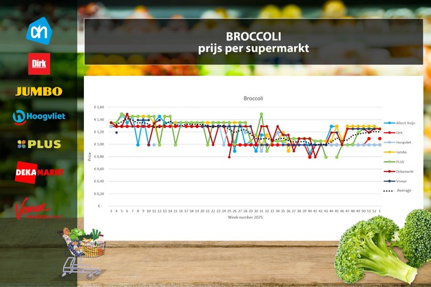 Weinig veranderingen in het broccolischap in de eerste week van 2026. Bij zowel Hoogvliet, Plus, Dirk en DekaMarkt blijven de prijzen gelijk. Alleen Albert Heijn en Jumbo gaan 4 eurocent omlaag naar beiden 1,25 euro.