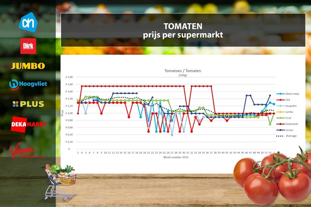 Nog altijd geen losse trostomaten in het online assortiment van Jumbo en Hoogvliet in de eerste week van 2026. Verder blijven de prijzen bij de andere supermarkten redelijk stabiel. Alleen Albert Heijn en Plus, waar de actie afgelopen is, dalen licht in prijs naar 1,25 en 0,99 euro.