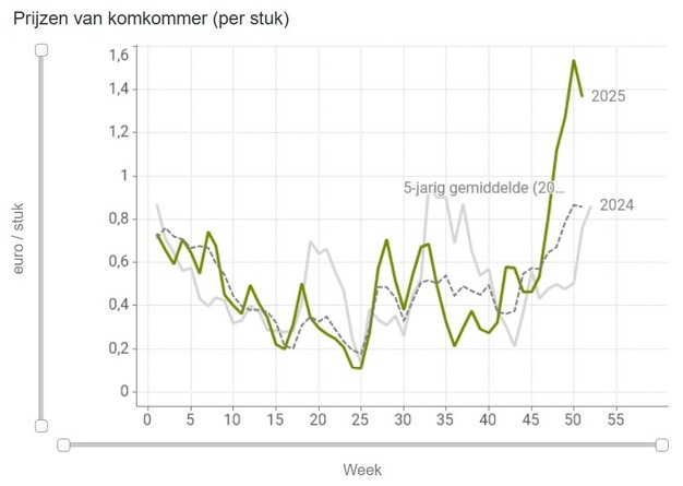 Hoewel de tomatenprijzen omhoog gingen tijdens de kerstperiode, zijn die nu weer gedaald van 1,95 euro per kg trostomaten naar 1,61 euro in week 1 van het nieuwe jaar. Dat blijkt uit de nieuwste VBT-cijfers. Ook de komkommerprijzen zijn gedaald: van 95 eurocent per stuk naar 69 eurocent in week 1.