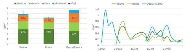 Opera in de zomerteelt gaf een totale productie van 3,09 kg/m² aan 12 planten per lopende meter. "De helft van de vruchten werd als groot gesorteerd, wat toch degelijk is voor een zomerteelt. Elsanta produceerde in het najaar 3,64 kg/m², hier konden we 73% van het fruit als groot bestempelen. Opgeteld gaf de traditionele glasinvulling in zomer en najaar een productie van 6,73 kg/m² aan 12 planten per lopende meter, met 2 plantingen wel te verstaan. Karima en Florice werden begin juli geplant, waardoor een zomerteelt Opera niet meer mogelijk was. De twee pieken oogsten lijkt dan ook noodzakelijk om een alternatieve invulling te kunnen betekenen. Karima leverde een productie van 5,88 kg/m² aan 6 planten per lopende meter. Met 77% groot fruit is de sortering uitstekend. Florice volgde met 5,16 kg/m² aan 6 planten per lopende meter. Ook hier met een geweldige 82% groot fruit. Het oogstverloop laat zien dat de doordragers met de eerste oogstpiek net na de Opera oogst komen, dus augustus. Florice kende de grootste eerste piek, maar bekocht dit met zijn tweede piek. Bij Karima kenden we betere plukprestaties in september en oktober. De tweede piek liep op zijn einde half november, net voor het wegzakken van de oogst van Elsanta."