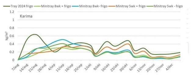 De oogstverlopen van de minitrays opgekweekt in het voorjaar van 2025 pieken minder dan de oogstverlopen van de trays opgekweekt in 2024. "Er is geen duidelijke eerste of tweede oogstpiek. De bloemaanleg gebeurt geleidelijk/continu en wordt minder of helemaal niet onderbroken door een lange frigobewaring. Met Karima kenden we plukprestaties tussen 200 en 500 g/m² per week. De 5 weken minitrays komen later aan de hoogste plukprestaties en gebruikten in de serre de tijd om productiepotentieel verder op te bouwen. Bij 8 weken minitrays plukken we vooral tussen 20/aug en 10/okt, terwijl die van 5 weken net wat meer gaven in oktober en november. Maar ook in zijn tweede piek in oktober en november geeft de klassieke tray grotere plukprestaties dan de verse minitrays en dat met 2 planten minder per lopende meter. Florice laat gelijkaardige resultaten zien, zij het iets minder productief dan Karima."