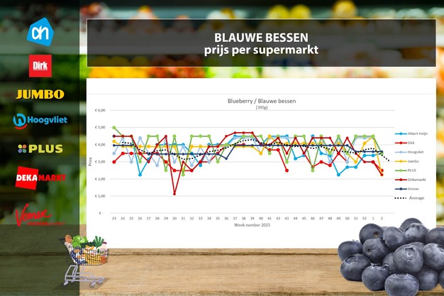 © Supermarktscanner.nl Supermarkten blijven consumenten triggeren met acties in blauwe bessen en in week 2 meer dan ooit. Bij 4 van de 6 onderzochte supermarkten komt de prijs tussen de 2,24 en 2,49 euro te liggen. De gemiddelde prijs van 300 gram blauwe bessen daalt maar liefst met 75 cent. Dat is ook extra de korting waar DekaMarkt mee stunt (actieprijs in week 1 was 2,99 euro en week 2 ligt deze op 2,24 euro). Ze hebben daarmee de laagste prijs. Jumbo ligt daar in week 2 met 1 cent iets boven, een korting op de vaste prijs van 2,25 euro. Dirk volgt met 2,49 euro (-50 cent). Albert Heijn en Hoogvliet zijn met actieprijzen van 3,49 euro flink duurder van de rest.