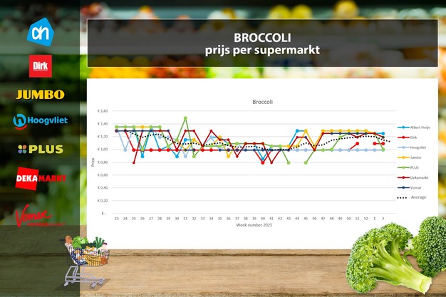© Supermarktscanner.nl Er zijn wat acties en prijsverlagingen bij broccoli in week 2 van 2026. Hoogvliet doet er 10 cent af en komt uit op 89 cent voor 500 gram. Plus haalt er 25 cent af en komt uit op 1 euro. DekaMarkt verlaagt de prijs met 6 cent naar 1,19 euro. Jumbo heeft een aanbieding met 1,19 euro. De gemiddelde weekprijs gaat 7 cent omlaag naar 1,11 euro.