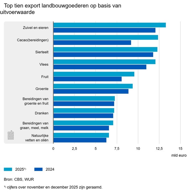 In 2025 heeft Nederland voor 137,5 miljard euro aan landbouwgoederen uitgevoerd. Dat is 8,4 procent meer dan het jaar ervoor. Dat melden Wageningen Social & Economic Research (WUR) en het Centraal Bureau voor de Statistiek (CBS) op basis van gezamenlijk onderzoek in opdracht van het ministerie van Landbouw, Visserij, Voedselzekerheid en Natuur (LVVN).