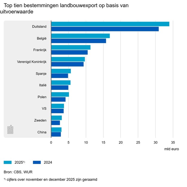 Traditiegetrouw is Duitsland de belangrijkste afnemer van landbouwgoederen uit Nederland. In 2025 ging 25 procent van de landbouwexport naar Duitsland. De landbouwexport naar Duitsland is met 10 procent in waarde toegenomen.