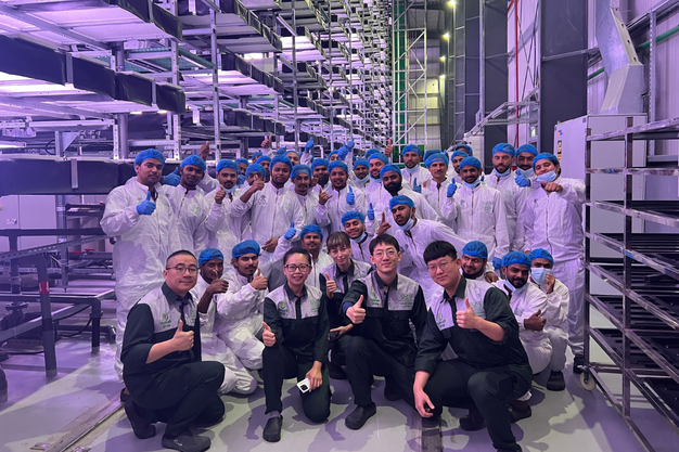 Stella Tsai en specialisten van YesHealth, samen met lokale operators van Mowreq in de vertical farm in Riyad