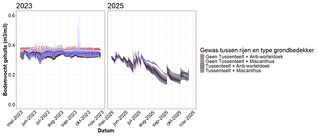 Figuur 3: Verloop van het bodemvochtgehalte binnen de frambozenveldjes tijdens de proeven, zowel in 2023 als in 2025. Elke lijn is het gemiddelde van drie metingen binnen hetzelfde veld. Het bodemvochtgehalte is per uur gemeten in de periode van mei tot en met november. De kleuren komen overeen met de veldbehandelingen; de grijze omheining van elke lijn is berekend op basis van de standaardfout van het gemiddelde.