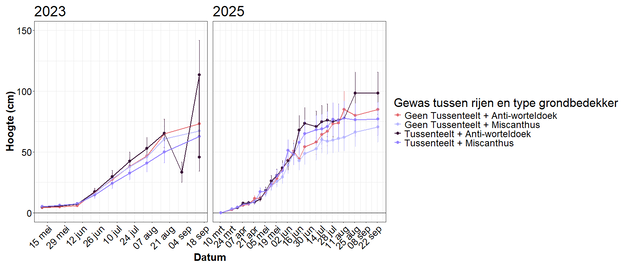 Vervolgens hebben de onderzoekers in zowel 2023 als 2025 de groeisnelheid en finale hoogte van de longcanes, de opbrengst van frambozen, het aantal onkruiden en het bodemvochtgehalte gemeten. Verder werden in 2024 verschillende oogstmethoden voor miscanthus met elkaar vergeleken.