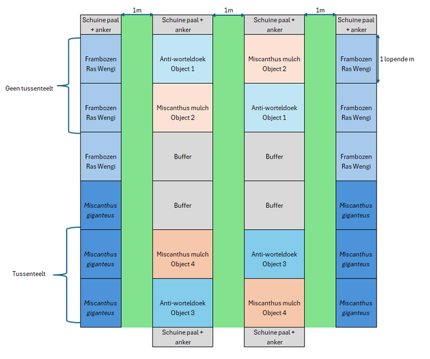 Om deze vragen te beantwoorden werd op Proefcentrum Pamel in 2023 een proefveld aangelegd waar verschillende longcanes van het frambozenras Wengi werden geplant met een dichtheid van 30 longcanes per lopende meter. Deze zijn in vier rijen van elk 6 meter aangeplant. Na drie meter werden de frambozen aan de buitenste rijen vervangen door rhizomen van het Aziatisch reuzengras Miscanthus x giganteus. Deze werden aangeplant met een dichtheid van 50 rhizomen/m². Verder is de helft van alle proefveldjes bedekt geweest met miscanthus als mulch, terwijl de andere helft is bedekt met anti-worteldoek. Dit resulteerde in vier proefobjecten, verdeeld over acht proefveldjes (Figuur 1):