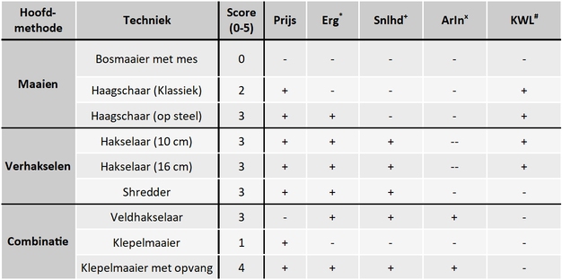 Tabel 1: Resultaten van de oogstproeven van miscanthus. De oogsttechnieken zijn verdeeld over de drie hoofdmethoden: maaien, verhakselen en combinatie Elke techniek heeft een score ontvangen van 0-5. Deze score is de som van de vijf categorieën waarop elke techniek werd beoordeeld ($).