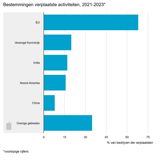 In 2021-2023 verplaatste ruim 5 procent van de middelgrote en grote bedrijven een deel van hun activiteiten naar het buitenland. Dit is vergelijkbaar met de voorgaande periode. Kostenbesparingen zijn hiervoor een belangrijke drijfveer. Meestal blijven de activiteiten na verplaatsing binnen de EU. Dat meldt het Centraal Bureau voor de Statistiek (CBS) op basis van nieuw onderzoek.
