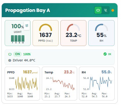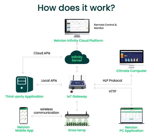 De open en flexibele architectuur van Netvion maakte integratie met dit op maat gemaakte platform mogelijk, waardoor de teler zijn eigen geavanceerde regelstrategieën kon implementeren en toch kon profiteren van draadloze belichting met hoge resolutie.