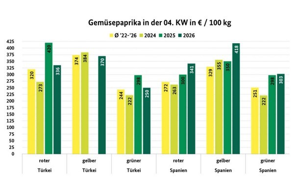 Spaanse paprika-aanvoer voerde duidelijk de boventoon op de Duitse markt. De aanwezigheid was over het geheel genomen weliswaar iets toegenomen, maar volgens BLE bleef de beschikbaarheid relatief krap. De hoge noteringen van de voorgaande week bleven daardoor gehandhaafd of liepen zelfs licht op. De vraag bleef daarop vrij beperkt. In het verlengde daarvan daalden de noteringen van rode en groene Spaanse partijen plaatselijk. De aanwezigheid van gele paprika's bleef doorgaans beperkt, waardoor de vaste prijzen standhielden.