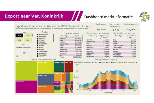 Het dashboard van GroentenFruit Huis biedt gedetailleerde marktinformatie van productie tot consumptie. Leden van de organisatie kunnen dit instrument gebruiken om trends en kansen in exportmarkten te volgen.