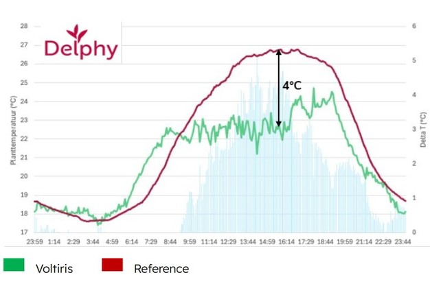 Voltiris en het Delphy Improvement Center hebben een jaarlange proef afgesloten waarin het effect van Voltiris spectraal filterende zonnepanelen op paprika is onderzocht. De productie van klasse I vruchten nam met 1,4 kg (9%) toe. Ook bleek de bladtemperatuur in de zomer zo'n 4°C lager te liggen onder de panelen. Vervolgonderzoek is nodig om de waargenomen verschillen beter te kunnen duiden.