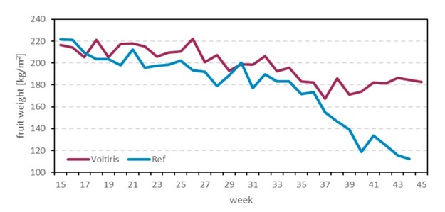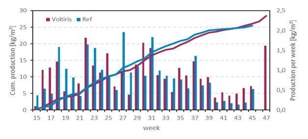 In de referentie ontstonden in de laatste maanden uitdagingen met de plantgezondheid. Mogelijk heeft de hoge planbelasting in het voorjaar een negatief effect gehad op de vitaliteit in de referentie. Als gevolg van de afnemende plantgezondheid daalde ook het vruchtgewicht en werd de oogst 2 weken eerder beëindigd dan onder de Voltiris panelen. Gedurende de proef werd 13% van de vruchten afgekeurd wegens te laag gewicht, tegenover slechts 5% onder de Voltiris-modules.
