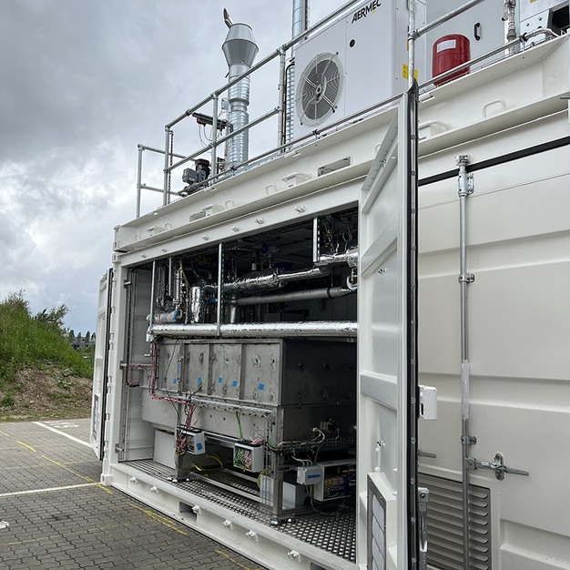 © New Energy Coalition Foto rechts: Een volledig gebouwde en operationele solid oxide elektrolyser die momenteel in Denemarken wordt getest voor fabrieksacceptatie. De elektrolyse van Dynelectro maakt gebruik van hoge temperatuur elektrolyse bij 750 graden Celsius. Door gebruik te maken van een gepatenteerde technologie kan de levensduur van de 'stacks' aanzienlijk worden vergroot. Door kortstondig elektrische spanning van de cellen af te halen, wordt degradatie sterk verminderd. Deze techniek wordt door Dynelectro aangeduid als AC:DC methodiek. Wanneer er restwarmte beschikbaar is, kan met deze technologie een efficiëntie van 90% worden gehaald. Doordat de elektrolyserunits modulair gemaakt worden, zijn deze makkelijk te stapelen, waardoor klein kan worden begonnen en makkelijk kan worden opgeschaald.