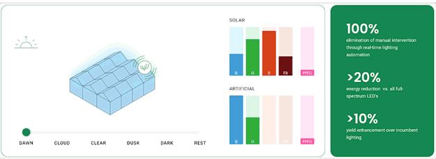 De logica past zich aan verschillende locaties en productieomstandigheden aan. Of het nu gaat om noordelijke regio's met weinig daglicht of zuidelijke regio's met hoge zoninstraling, het platform regelt verlichting op basis van de actuele situatie. "Op een zonnige of bewolkte dag geeft het algoritme alleen het licht dat de plant kan gebruiken," zegt James.