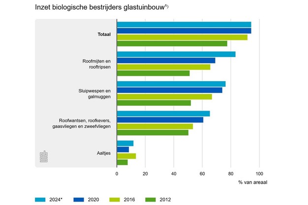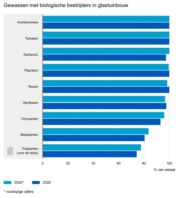 Bij de meeste gewassen in de glasteelt worden op meer dan 95 procent van het areaal biologische bestrijders ingezet tegen plaaginsecten en spintmijten. Bij de teelt van komkommers en tomaten worden deze al sinds 2020 ingezet op bijna het hele teeltoppervlak. Bij potplanten voor de bloei en bladplanten ligt dit percentage lager, maar nog ruim boven de 75 procent.