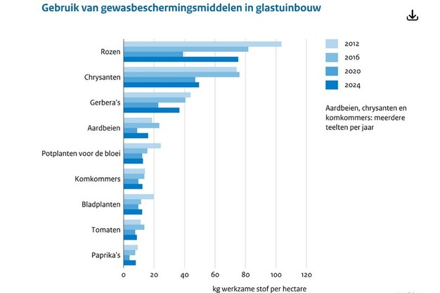 In de glastuinbouw was het gebruik van gewasbeschermingsmiddelen per hectare hoog bij rozen, chrysanten en gerbera's. Bij deze drie gewassen daalde het gebruik per hectare sterk in 2020 ten opzichte van 2016. Bij rozen en gerbera's steeg het gebruik weer in 2024. Deze stijging komt grotendeels door het hogere gebruik van duurzame middelen zoals vetzuren en kaliumzouten. Deze middelen worden in hoge volumes gebruikt. Deze trend, een stijging in het gebruik per ha in 2024 ten opzichte van 2020 door een toename in het gebruik van duurzame middelen, is ook te zien bij andere glastuinbouwgewassen.
