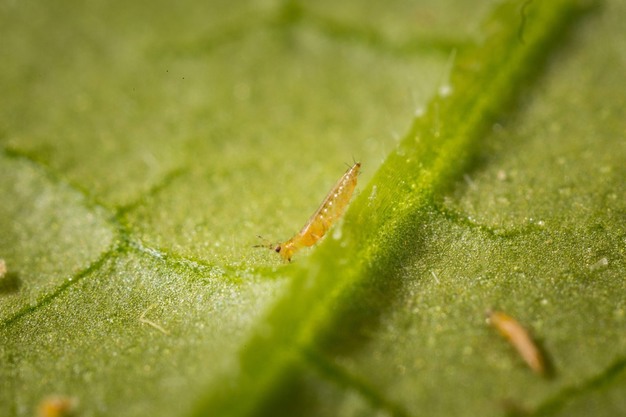 De trips is erg klein, maar kan ook flinke schade veroorzaken. Dit doen ze door plantcellen aan te prikken en leeg te zuigen. De meest vervelende schade die ze veroorzaken, zijn kromme komkommers.