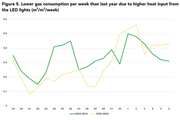 Figuur 5. Lager gasverbruik per week dan vorig jaar door hogere warmte-input van de LED-lampen (m3/m2/week)