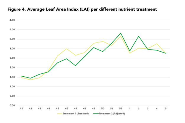 Net als in de vorige twee proeven die door de partners werden uitgevoerd, waren de lagere nitraatconcentraties aan het begin van het gewas bedoeld om de bladoppervlakte-index (figuur 4) te beheersen en een generatieve plantbalans te bereiken. Dit werd gerealiseerd. Het nitraatgehalte in het druppelwater bleek echter tijdelijk te laag te zijn, waardoor de nitraatopname aanvankelijk minder was dan nodig (zie de blauwe lijn in figuren 2 en 3). "Dit is een proef en we moesten de pijnpunten vinden", zegt Lee. "Helaas heeft dit ons wat ontwikkelingssnelheid gekost. Gelukkig werd de situatie onmiddellijk gecorrigeerd door de nitraatconcentraties te verhogen, wat aantoont dat de GT Master-slabs niet alleen voor het watergehalte en de EC, maar ook voor individuele voedingsstoffen kunnen worden aangestuurd", voegt hij eraan toe.