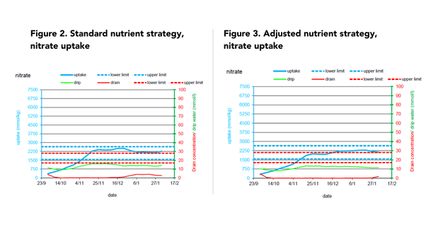 Naast een gunstige K/N-opnameverhouding om wankleuring te beperken, stellen de onderzoekers ook dat een minimale nitraatopname belangrijk is om voldoende vegetatieve groei te behouden en tegelijkertijd de kaliumopname te ondersteunen. De verhoogde kaliumconcentratie in de aangepaste voedingssamenstelling heeft geleid tot lagere concentraties magnesium en calcium in het druppelwater. Ondanks een 60% lager magnesiumgehalte in het druppelwater van de aangepaste voedingssamenstelling, is de opname echter 60% hoger in vergelijking met de standaard. In de aangepaste strategie is het calciumgehalte (µmol/kg drooggewicht) van de vruchten ook hoger dan het vastgestelde minimum van 30 µmol/kg drooggewicht dat bloesemrot zou veroorzaken.